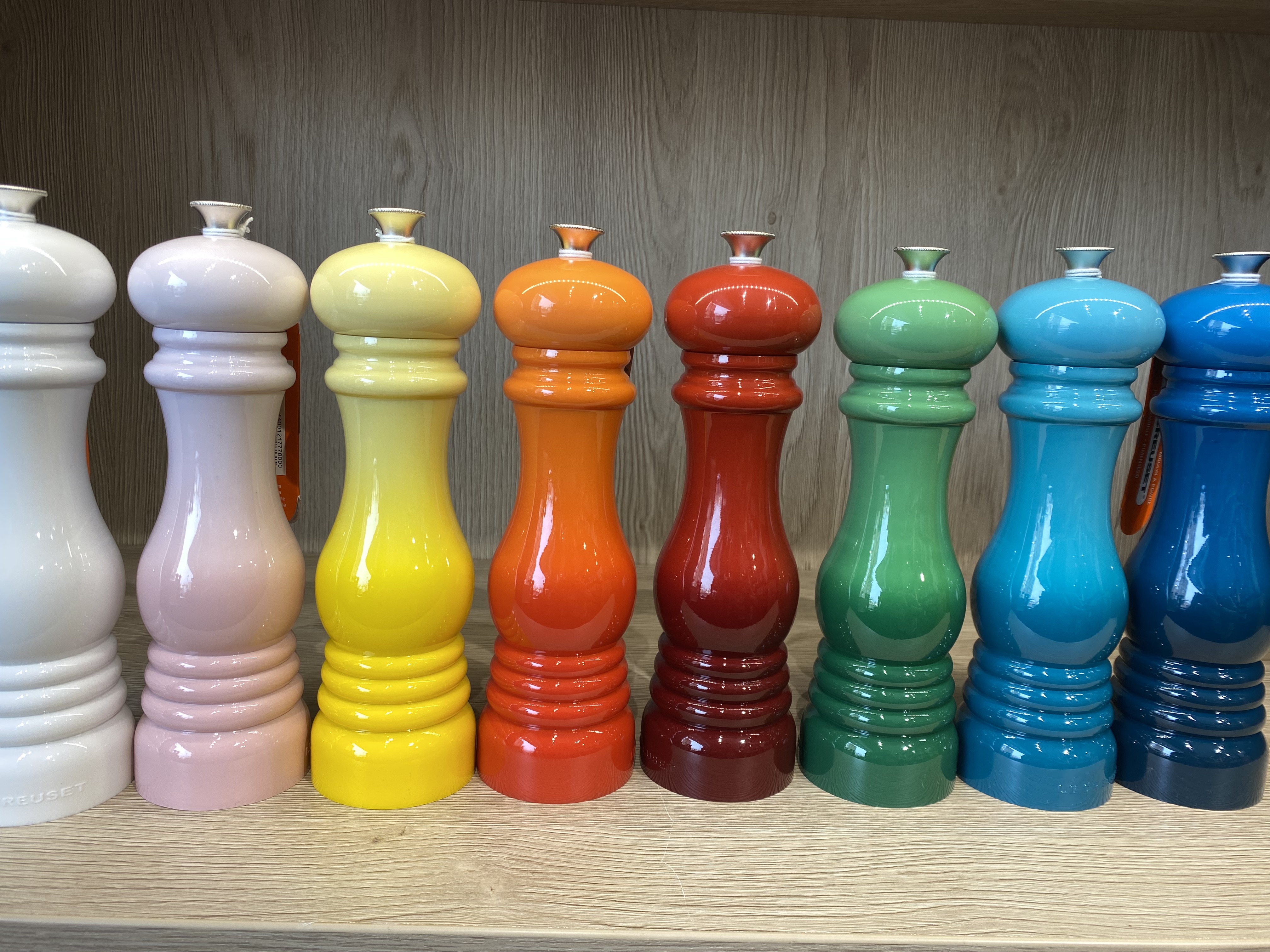 Wat zeker niet mag missen zijn de handige en kleurrijke peper- en zoutmolens van Le Creuset.