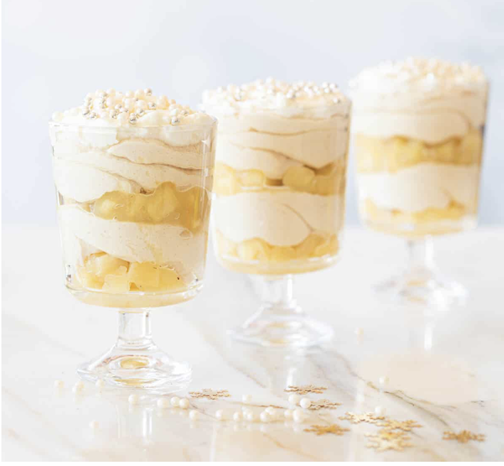 Vul de glaasjes om en om met het roommengsel en de afgekoelde appelsaus, van beiden ongeveer 2 laagjes.