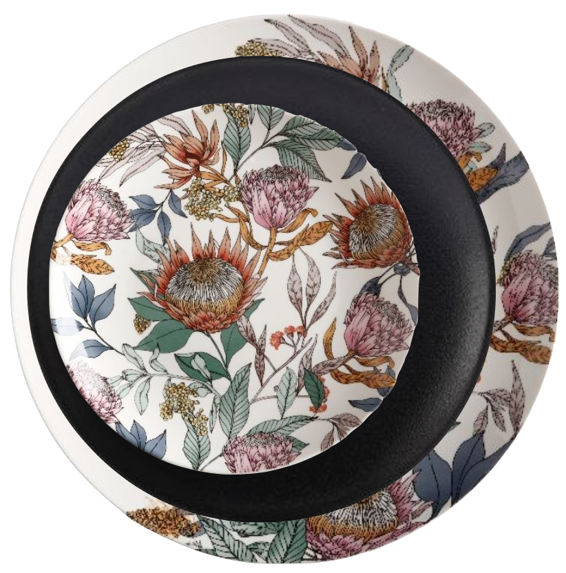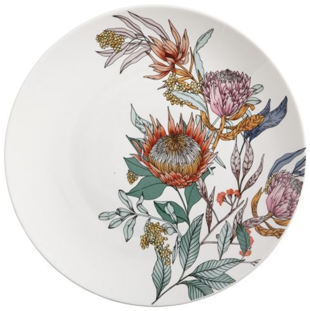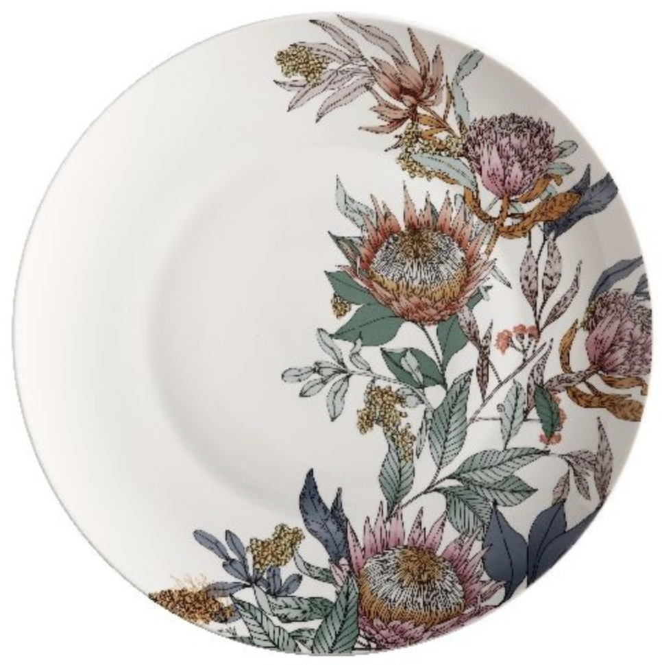 Waratah dinerbord 27.5 cm. Het bord heeft aan de rechterkant een mooie print en is links wat rustiger. Geniet van een heerlijk diner van dit stoere dinerbord met bloemenmotief.