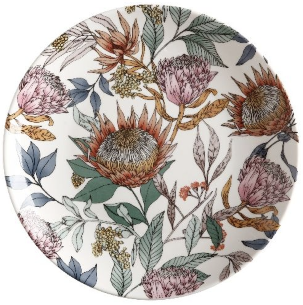 Waratah ontbijtbord 23 cm. Het bord heeft aan de rechterkant de Waratah print en is aan de linkerkant meer wit. Dit prachtige sierwerk zorgt voor kleur op de ontbijttafel.