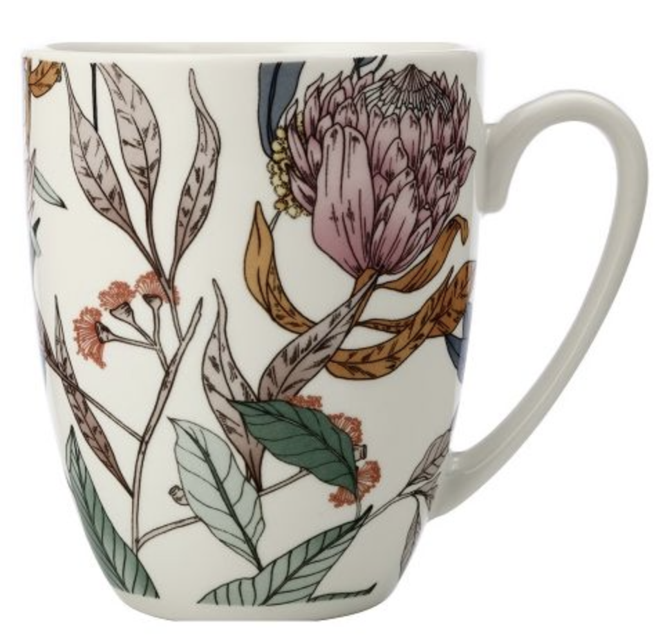 Waratah beker / mok 450 ml. De beker is in de binnenkant wit en heeft aan de buitenkant een mooie bloemenprint. Als je nog geen zin hebt in een lekkere kop thee dan krijg je het wel van deze mok.