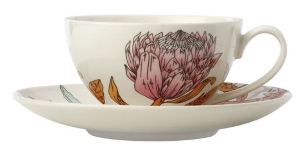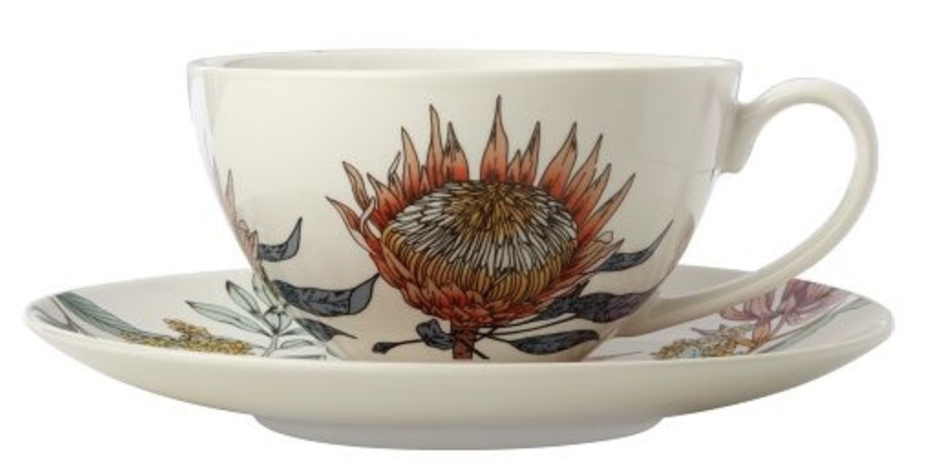Waratah kop en schotel 400 ml. Het kopje heeft een witte binnenkant en heeft aan de buitenkant een mooie print. Het schoteltje is ook voorzien van de Waratah bloem. Dit is het grootste kop en schotel setje van de 3 kop en schotels in de Waratah collectie.