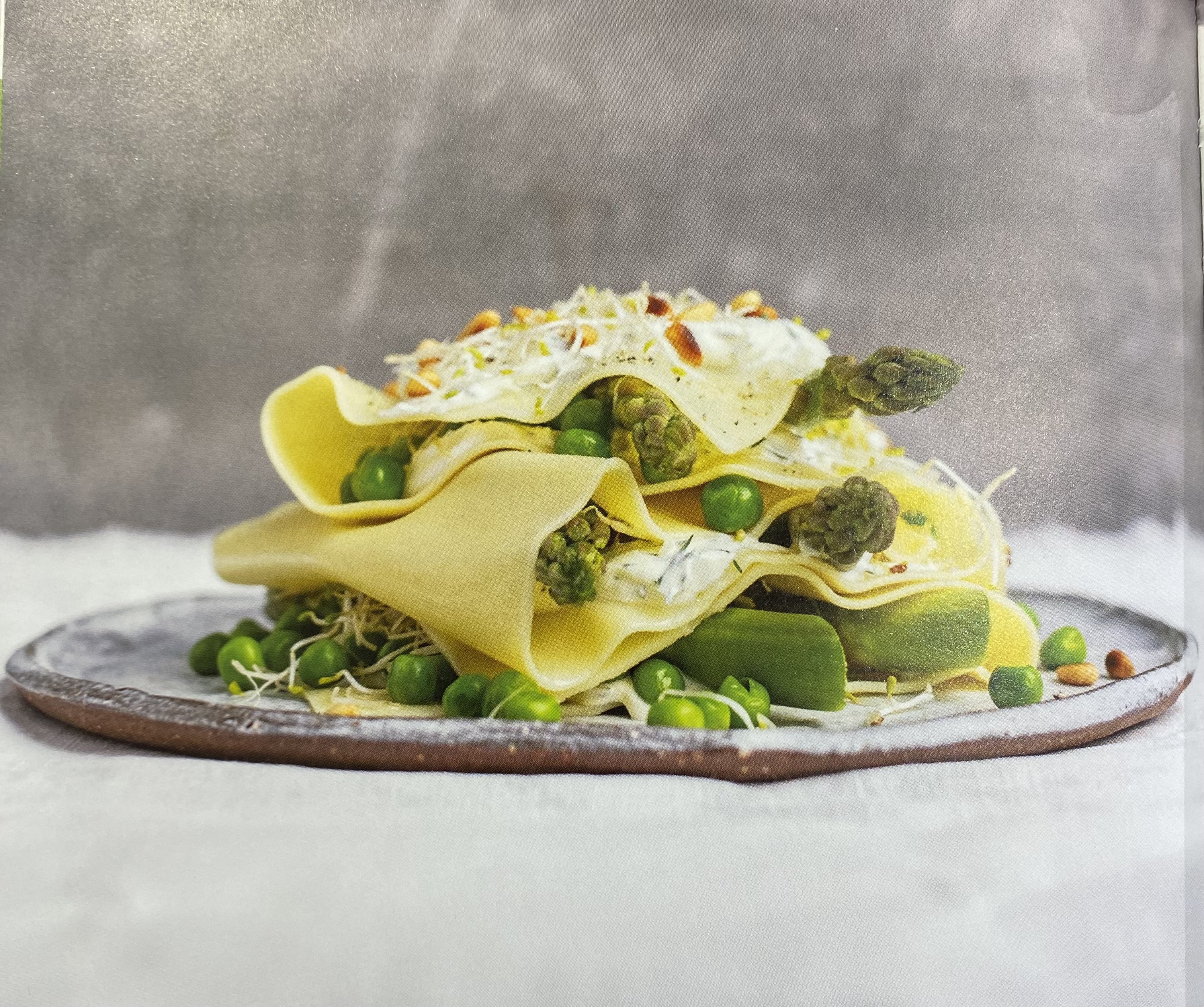 - Leg op elk blad een lasagneblad, besmeer met 1 eetlepel saus, verdeel een derde van de asperges, doperwten en alfalfa erover en bedek met een volgend lasagneblad. Herhaal deze stappen totdat de groente en lasagnebladen op zijn. Giet de rest van de saus over de bovenste laag en garneer met de pijnboompitten en overige alfalfa.