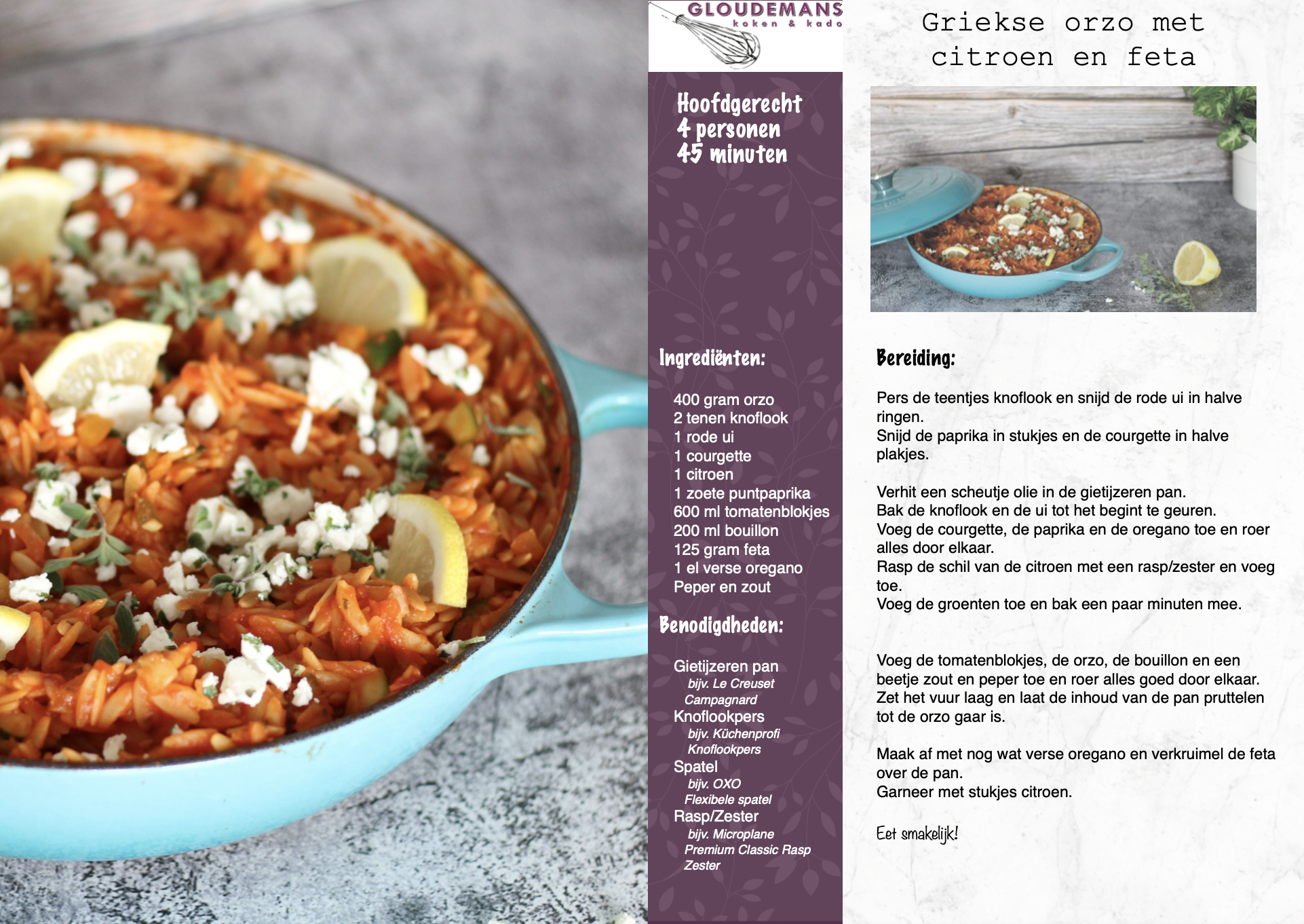 Dit keer hebben we gekozen voor een Grieks Orzo recept. Orzo is een nog redelijk nieuw begrip in Nederland. Is het nu pasta of is het rijst? Eigenlijk is het een beetje van beiden. Het is een pastasoort in de vorm van rijst. De rijst wordt gegaard in een combinatie van tomatensaus en bouillon. Er worden lekker veel groenten aan dit recept toegevoegd, zoals courgette en puntpaprika. De feta en tomatenstukjes zorgen voor het Griekse tintje. Voor het frisje worden er citroenzest en citroenpartjes toegevoegd.
