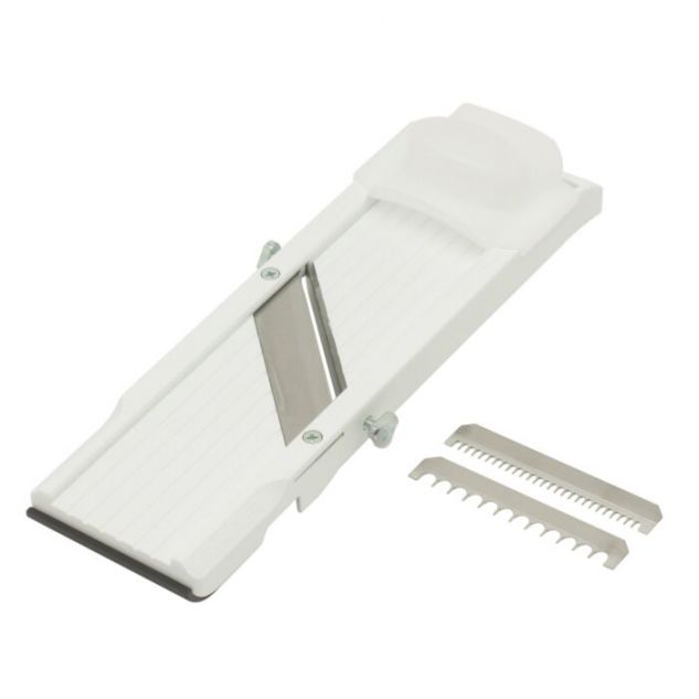 De Benriner mandoline is een van de populairste Japanse mandolines. Een echt begrip onder de koks! Het mes in de mandoline is vlijmscherp zo maak je met gemak plakjes of jullienne reepjes. Het wisselen van de getande messen gaat zeer snel en gemakkelijk. De mandoline heeft een snijvlak van 6,4 cm breed en de snijdikte van het mes is traploos verstelbaar van 0,5 tot 5 mm. Bij de mandoline worden drie roestvrijstalen mesjes geleverd voor het snijden van reepjes met een breedte van 2, 3 en 4 mm.