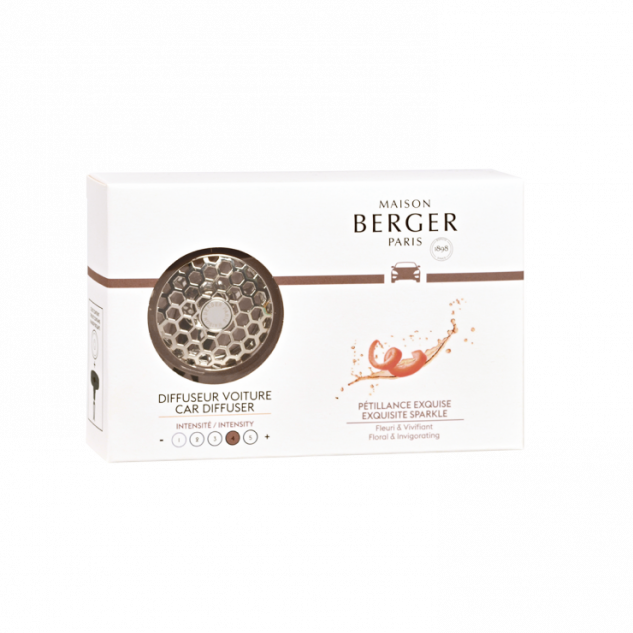 Een geurige ode aan feestelijke bruiswijn en de Franse levenskunst. Maar ook een eerbetoon aan de onuitputtelijke vindingrijkheid van Maison Berger Paris, zijn oog voor detail en zijn eis van kwaliteit voor al zijn creaties. Een origineel en mooi voorwerp dat een ware must is! Een kleine, mooi ronde car diffusor met een honingraatmotief en een duidelijk aanwezige chroomkleur. Een zeer praktische, in alle richtingen draaiende metalen klem om het op de luchtroosters te kunnen vastklikken. Een hart van keramiek voor een gelijkmatige en subtiele verspreiding, de belofte van een langdurig geurende atmosfeer, dankzij de navulling.