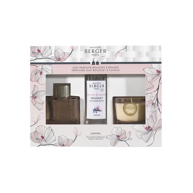Het mini duo set Bolero Liliflora bestaat uit een kleine parfumverspreider met staafjes en een mini geurkaars, zodat u op een aangename wijze kennis kunt maken met de geurige rituelen van Maison Berger. Hun elegante design en tijdloze kleur weten uw interieur op sobere wijze te verfraaien. Dit setje is voorgevuld met het nieuwe huisparfum, Liliflora.