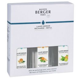 Lampe Berger heeft naast de 500 ml flacon en de 1 liter flacon ook en trioverpakking. Elk semester van het jaar komen er 3 nieuwe geuren uit, om kennis te maken met alle drie de geuren en niet meteen drie keer 16,95 te moeten betalen is deze verpakking uitgebracht. Een verpakking bevat dus de 3 nieuwe geuren met flesjes van 250 ml en kost dit setje samen 19,95 euro.