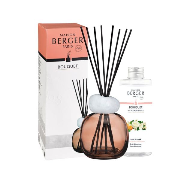 Het Lady Flower geurboeket verspreidt een verfijnde bloemengeur, waarin jasmijn, mimosa en roos samenkomen voor een elegante sfeer. Een heerlijke geur voor in deze moderne design fles 'Mineral plum. Een nieuwe manier om de geur van Maison Berger te verspreiden in jouw woning. Een exclusieve fles van glas met witte steen 'mineral' en zwarte sticks. Een tijdloos ontwerp om jouw interieur op een subtiele maar continue wijze te voorzien van een aangenaam parfum. De sticks zijn vervaardigd met polymeertechniek en zorgen voor een optimale verspreiding van het parfum. Meer over het Lady Flower huisparfum: