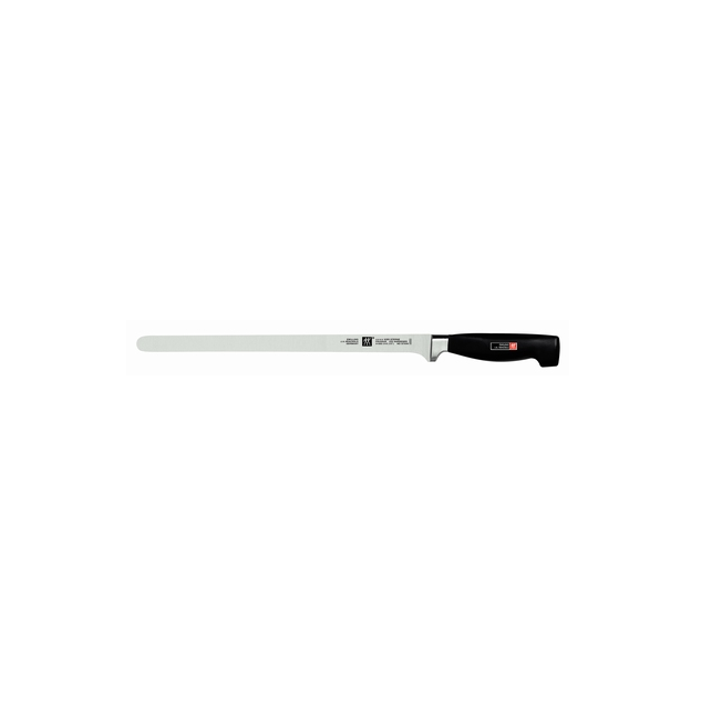 Zwilling Four Star Zalmmes**** is een zeer flexibel mes. Flinterdunne plakjes zalm snijd je met het zalmmes. Dit lange mes heeft een extra smal, flexibel lemmet en een afgeronde punt. Hoewel zalmmessen zijn bedoeld om zalm te snijden zijn ze ook prima voor het verkrijgen van dunne plakjes ham.