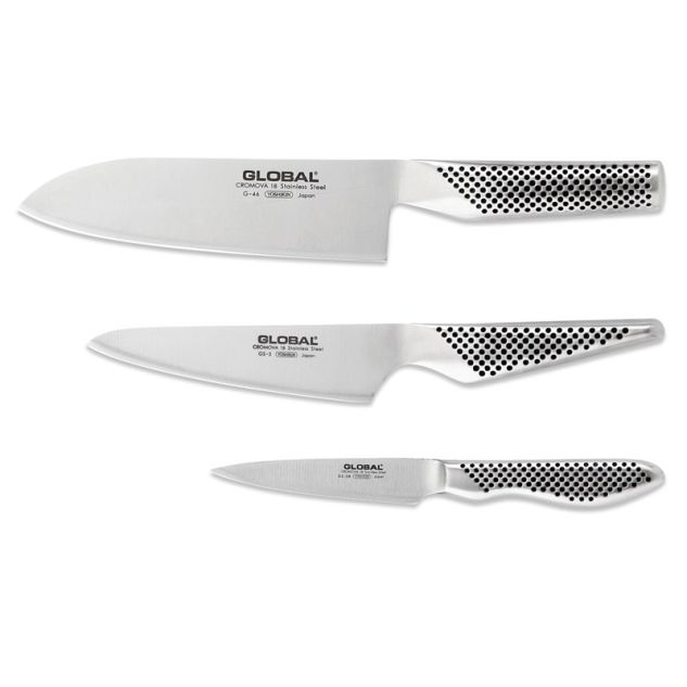Deze 3-delige messenset bestaat uit een Global G46 Santokumes, GS3 steakmes en GS38 officemes. Een uitstekende set om voordelig twee van de meest gebruikte keukenmessen aan de schaffen. Ten behoeve van het hebben van optimale grip, hebben de ergonomisch gevormde handgrepen kleine kuiltjes. Daarbij zijn handgreep en lemmet gesmeed uit één stuk staal. Dat houdt in: geen kwetsbare onderdelen, zoals een houten handgreep of klinknagels. Deze messen kunnen beslist tegen een stootje!