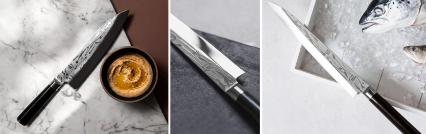 Zoals eerder benoemd vind je binnen deze serie voornamelijk yanagiba’s en deba’s. Dit zijn klassieke Japanse keukenmessen voor vlees en vis. De yanagiba is een lang mes dat gebruikt wordt voor het snijden van sashimi. Een yanagiba heeft een lang lemmet waarmee je in één haal door een stuk vlees of vis snijdt. Je voorkomt hiermee een zagende beweging en krijgt zo het mooiste resultaat. Deba-messen zijn Japanse trancheermessen. Ontworpen voor het fileren van vis (graten en wervels) en schaaldieren. Om bestand te zijn tegen breuken is het lemmet van een deba een stuk dikker dan dat van een normaal keukenmes.