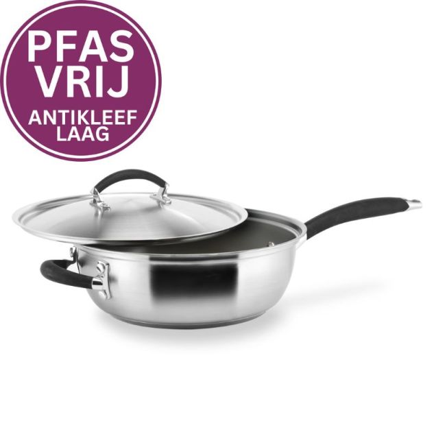 De allerbeste roestvrijstalen hapjespan met keramische coating; absoluut PFAS-vrij. De roestvrijstalen koekenpannen, crepespan, chefspan en wok zijn voorzien van de extreem harde keramische Greblon CK2 coating. In al deze bakpannen krijg je een perfect bakresultaat met minder olie of boter. De etensresten komen gemakkelijk los en je pan is in een handomdraai weer schoon. Na gebruik de pan direct schoonmaken met een sponsje (grove zijde) en afwasmiddel!