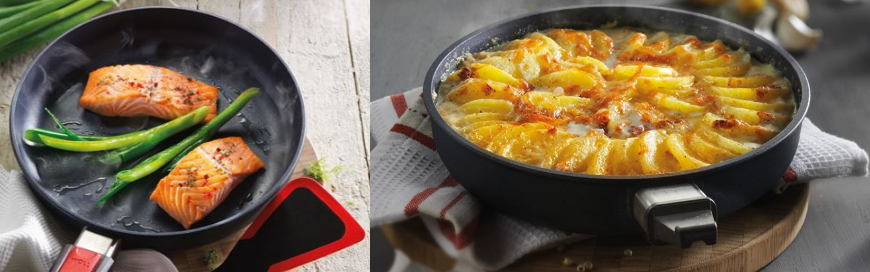 De pannen van Woll hebben als enige een greep die gemakkelijk afneembaar is. Hierdoor is de pan heel eenvoudig in de oven te zetten, maar dit bespaart u ook veel ruimte in de keukenkastjes of vaatwasmachine.