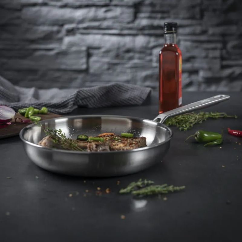 Dankzij het hoogwaardige 5-laags meerlaags materiaal en een materiaaldikte van 3,2 mm is de ongecoate CULINARY FIVEPLY koekenpan extreem robuust en duurzaam. De bijzondere combinatie van verschillende legeringen (RVS - aluminium - RVS) concentreert de warmte niet alleen op één plek, maar verdeelt deze ook gelijkmatig over het gehele oppervlak tot aan de rand. Hierdoor wordt je eten gelijkmatig vanaf de zijkant verwarmd.