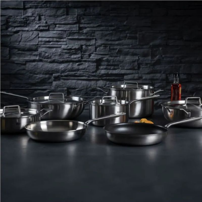 De ergonomische roestvrijstalen handgreep blijft zelfs bij hoge temperaturen koel en is daardoor zeer comfortabel in gebruik. De gesloten rand zonder scherpe randen maakt het uitschenken van sauzen eenvoudiger. Deze serie bevat de volgende 3 koekenpannen: