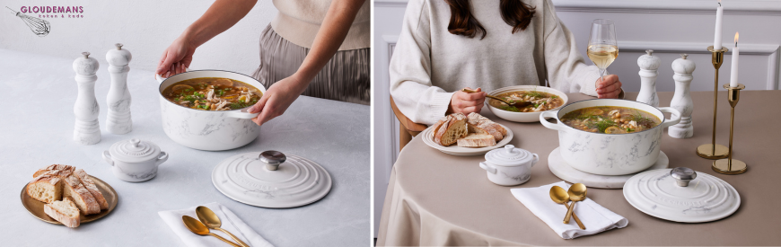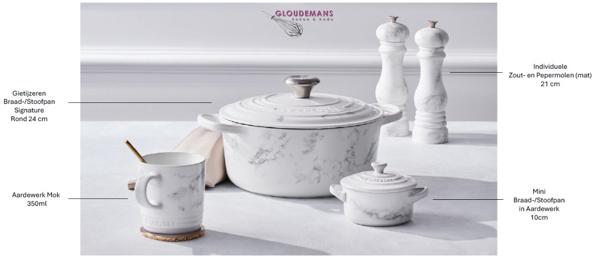 Marble is geïnspireerd op klassieke architectuur en de prachtige grijsgeaderde appliqué en glanzend witte afwerking doen denken aan de gevierde steen uit Carrara , Italië. Marmer wordt aanbeden door ontwerpers vanwege de duurzame stijl die bestand is tegen hitte en de elementen en brengt tijdloze luxe in elke keuken en op elke tafel. Welke onderdelen zitten er in deze prachtige collectie van Le Creuset?