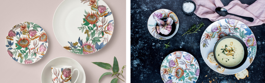 Het levendige design zet het bloemenmotief in een ander daglicht. Het is niet lief en zacht, maar stoer en straalt kracht uit. Het Waratah servies is heel mooi te combineren met een zwart servies. Bijvoorbeeld het zwarte Caviar Black servies van Maxwell and Williams. Maar dat is natuurlijk geen must, ook met een ander zwart servies komt het Waratah servies goed tot zijn recht.